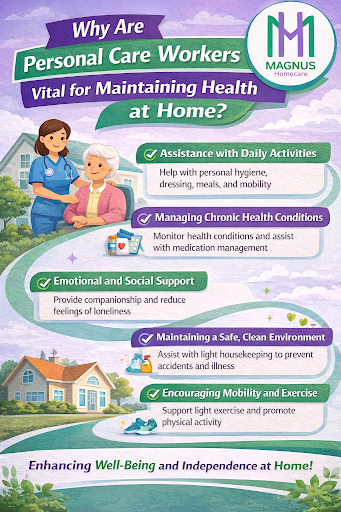 Personal care workers monitor symptoms of chronic conditions, assist with daily activities, and ensure that medications are taken on time. They help prevent complications, reduce hospital visits, and promote long-term health management.
